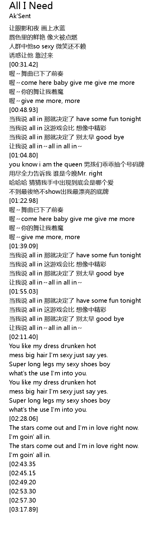 | [03:00.93][02:45.15] | dang wo shuo all in na jiu jue ding le have some fun tonight |