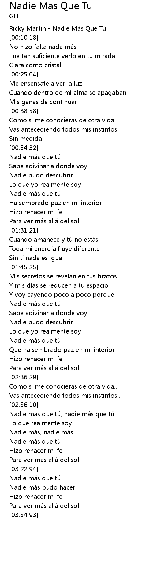 | [00:00.00] | Ricky Martin - Nadie Más Que Tú |