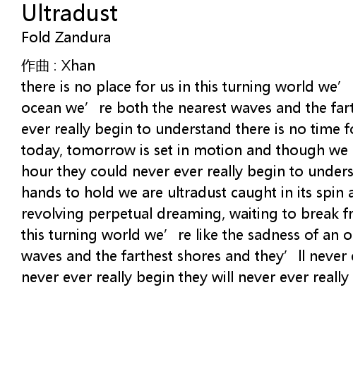 | there is no place for us in this turning world we' re like the sadness of an ocean we' re both the nearest waves and the farthest shores and they' ll never ever really begin to understand there is no time for us on this spinning earth today, tomorrow is set in motion and though we might be living in our finest hour they could never ever really begin to understand the world is not in our hands to hold we are ultradust caught in its spin and flux all the while, revolving perpetual dreaming, waiting to break free there is no place for us in this turning world we' re like the sadness of an ocean we' re both the nearest waves and the farthest shores and they' ll never ever really begin they could never ever really begin they will never ever really begin to understand |