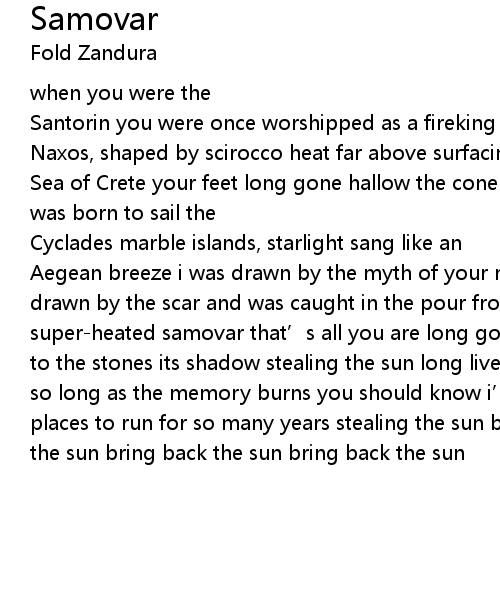 | Aegean breeze i was drawn by the myth of your monolith like a perfect face is drawn by the scar and was caught in the pour from a blast in the core like a superheated samovar that' s all you are long gone hollow the cone volcano down to the stones its shadow stealing the sun long live the tears see how they run so long as the memory burns you should know i' ll never return you shadowed places to run for so many years stealing the sun bring back the sun bring back the sun bring back the sun bring back the sun |