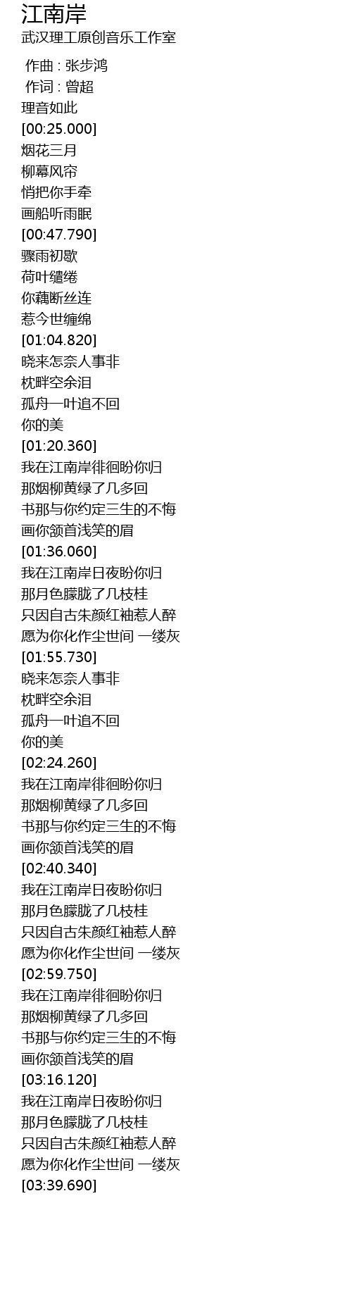 | [03:00.420] | 我在江南岸徘徊盼你归 |