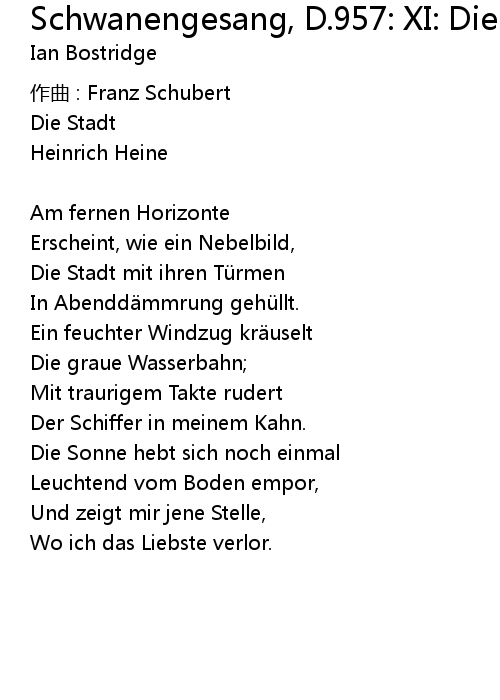| Song | Schwanengesang, D.957: XI: Die Stadt (Heine) |