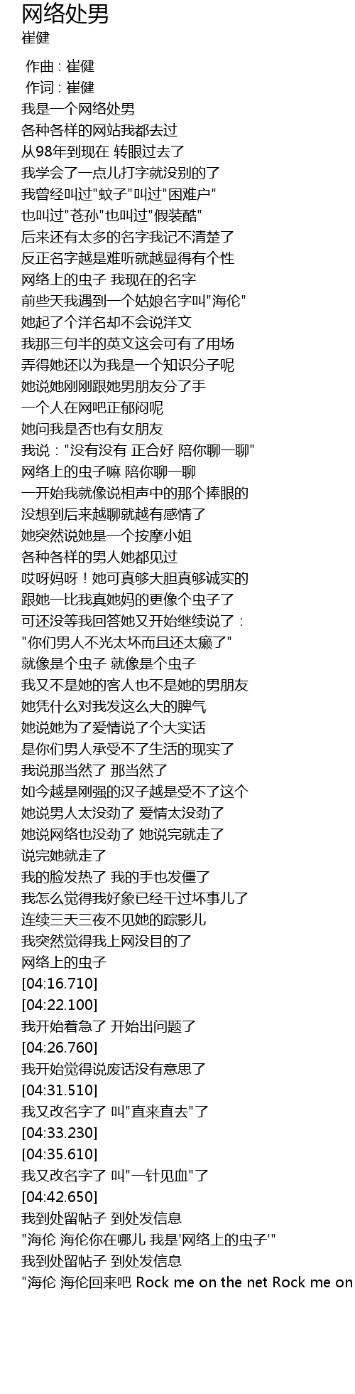 | [04:45.090] | " hǎi lún hǎi lún nǐ zài nǎ ér wǒ shì' wǎng luò shàng de chóng zi'" |