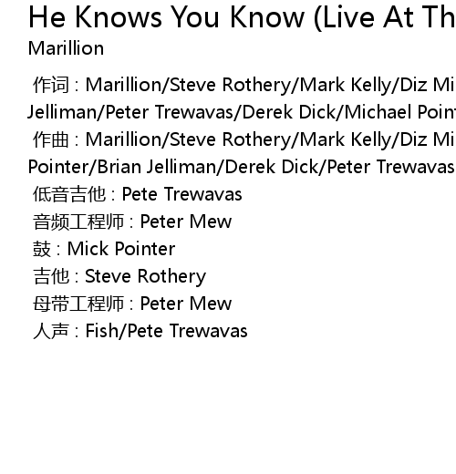 | [00:00.000] | zuò cí : Marillion Steve Rothery Mark Kelly Diz Minnett Brian Jelliman Peter Trewavas Derek Dick Michael Pointer |
