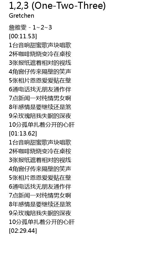| [00:07.53] | 詹雅雯 - 1~2~3 |