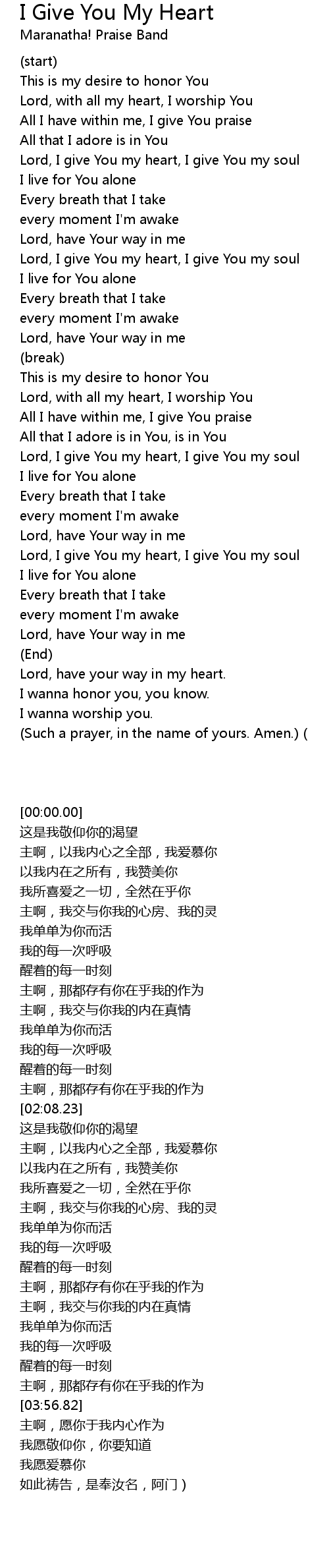 | [03:04.90] | Lord, I give You my heart, I give You my soul |
