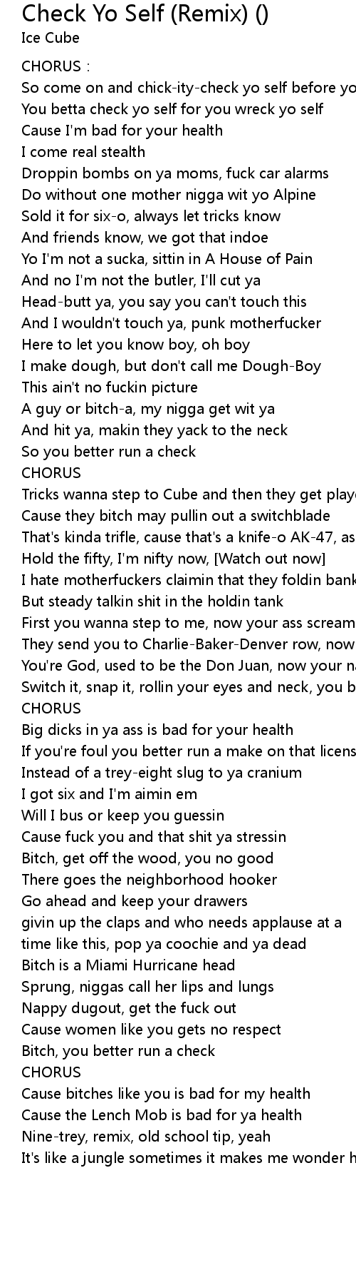 | So come on and chickitycheck yo self before you wreck yo self | |