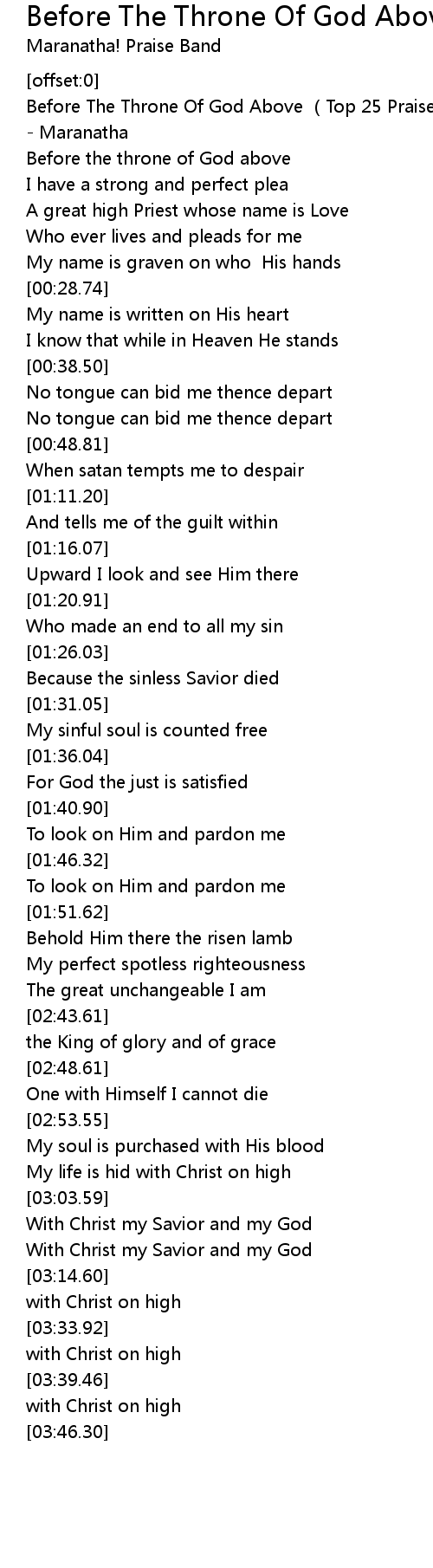 | [00:01.56] | Before The Throne Of God Above Top 25 Praise Songs 2007AlbumVersion Maranatha |