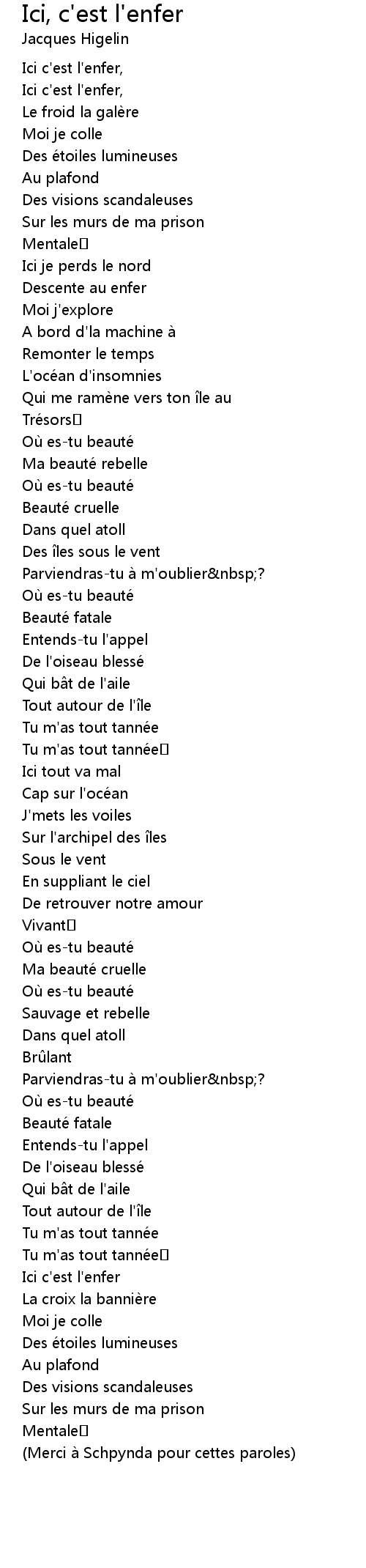 | Merci à Schpynda pour cettes paroles |