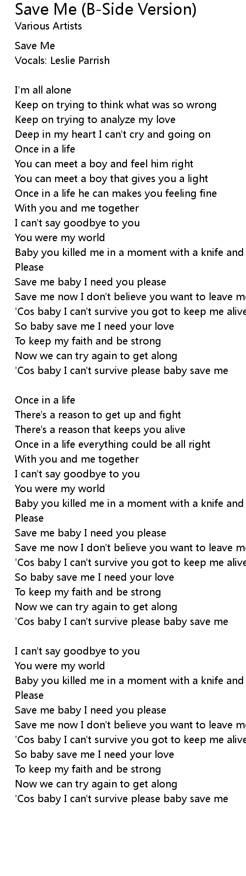 'Cos baby I can't survive please baby save me |