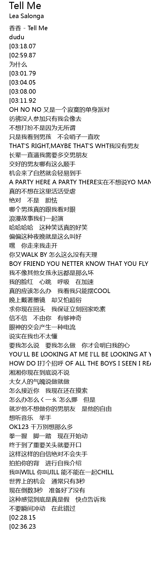 | [03:32.22][02:59.87][02:43.19][01:39.45][00:51.78][00:03.43] | JUST TELL ME wei shi me |