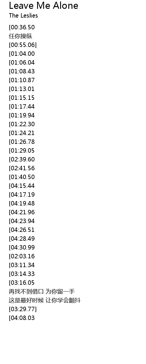 | [04:12.40][04:08.03][04:03.54][03:59.01][03:54.47] | Hey Leave Me Alone |