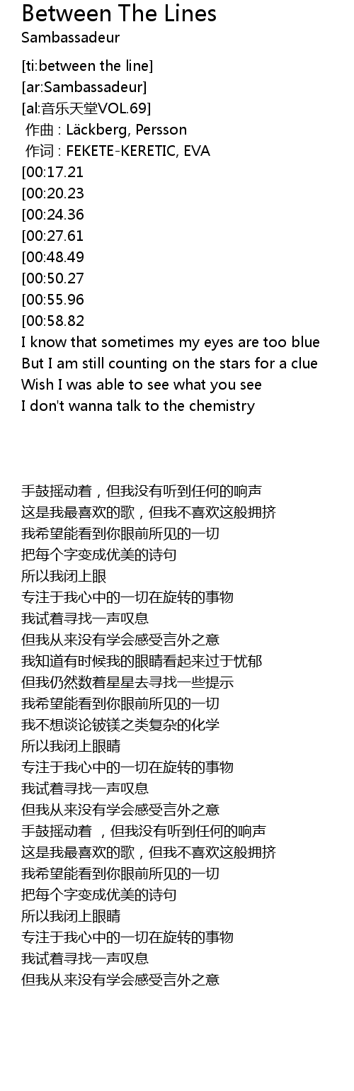 | [02:30.40][00:58.82][01:44.51] | But I never learn to read bewteen the lines |