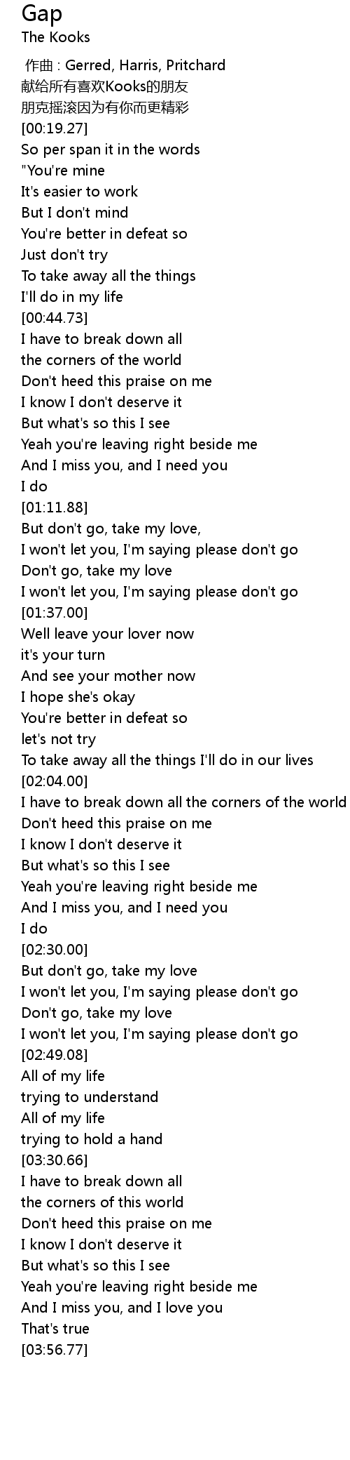 | [01:15.10] | I won't let you, I'm saying please don't go |