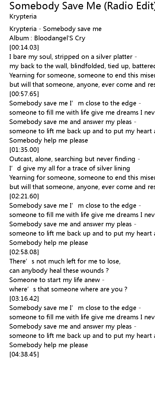 | [04:18.01] | Somebody save me and answer my pleas - |