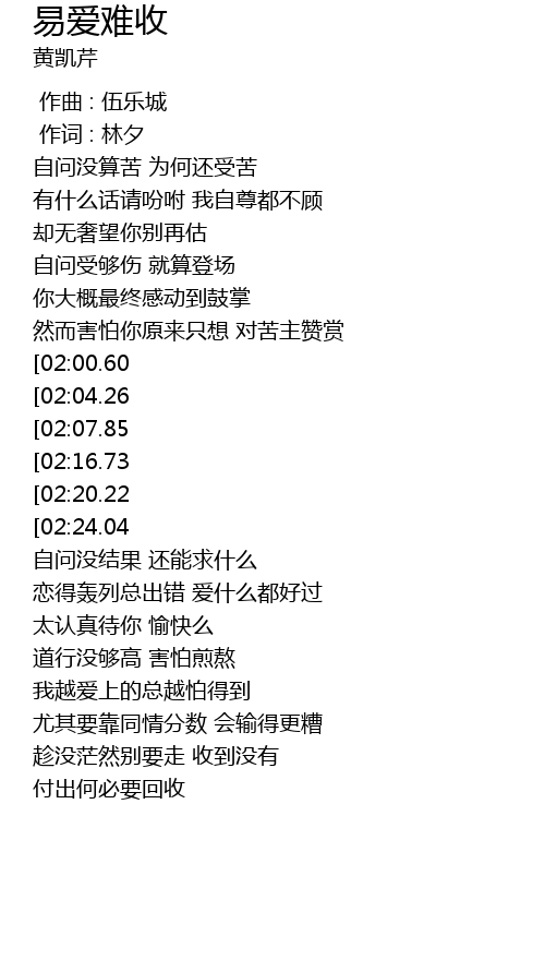 | [03:05.39][02:20.22][01:05.09] | 容易爱 越爱你越难受 |