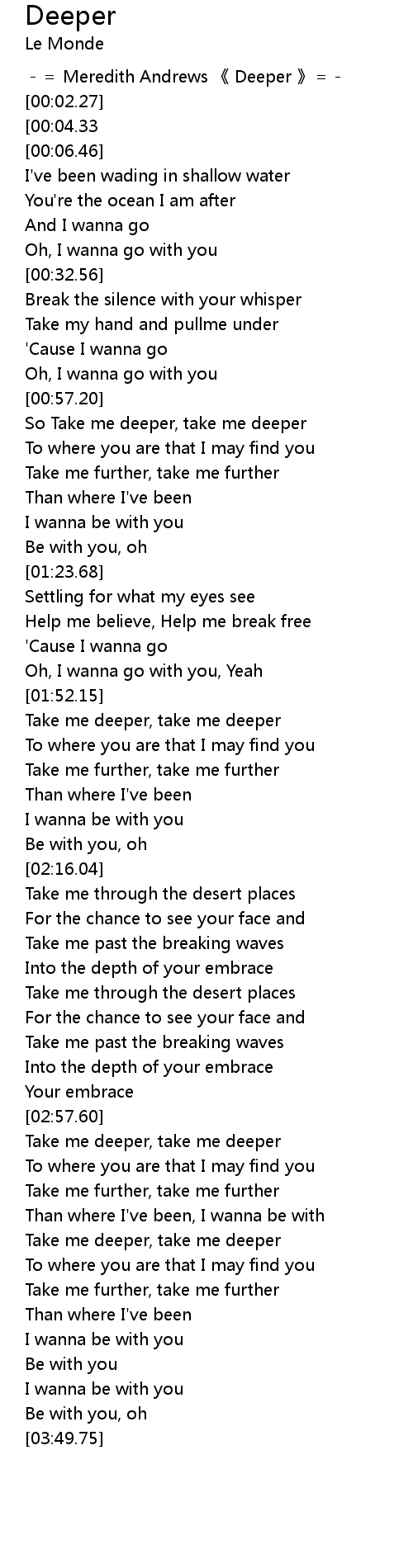 | [00:00.00] | -= Meredith Andrews 《 Deeper 》=- |