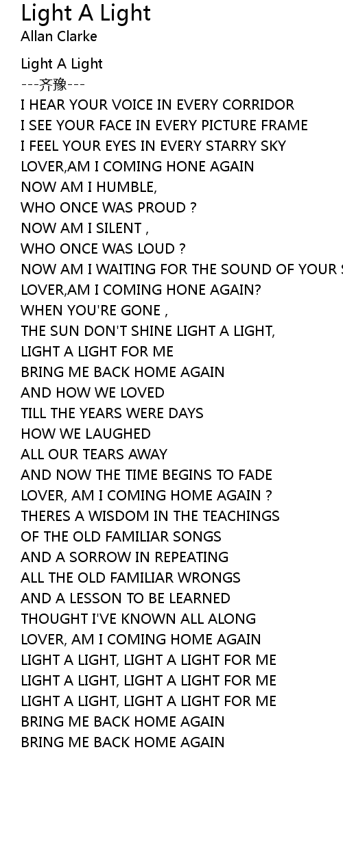 | [02:07.01] | LIGHT A LIGHT, LIGHT A LIGHT FOR ME |