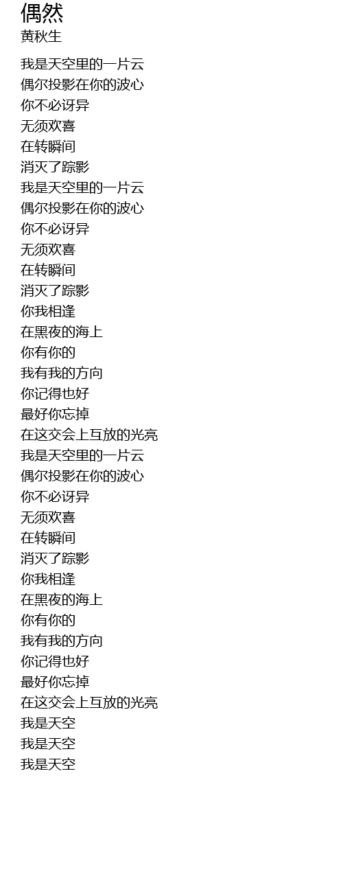 | [00:44.32] | wǒ shì tiān kōng lǐ de yī piàn yún |