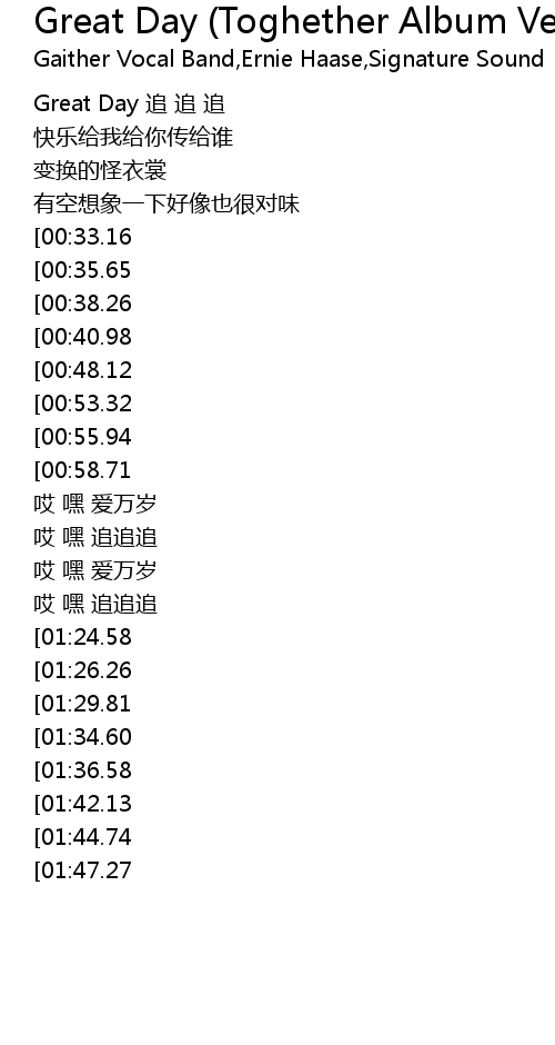 | [01:58.58][00:33.16] | Great Day zhui zhui zhui |
