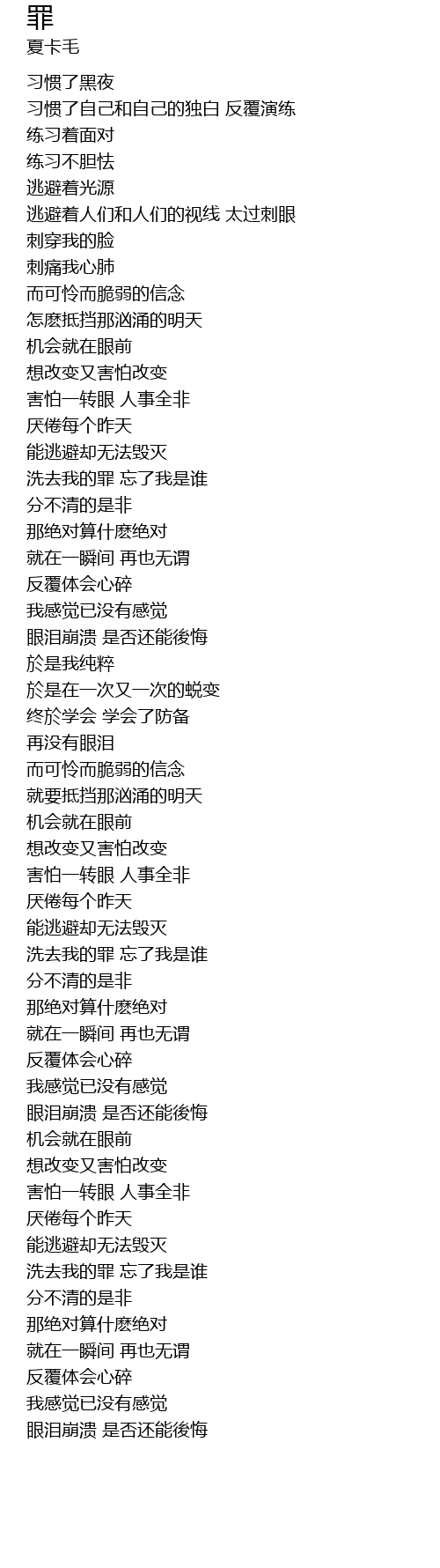 | [02:53.700] | 洗去我的罪 忘了我是谁 |