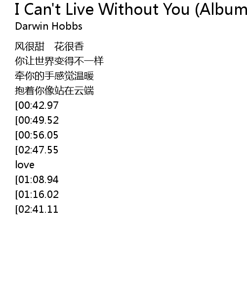 | [03:01.13][02:47.55][02:21.38][01:28.75][01:02.25] | oh i can't live without your love |