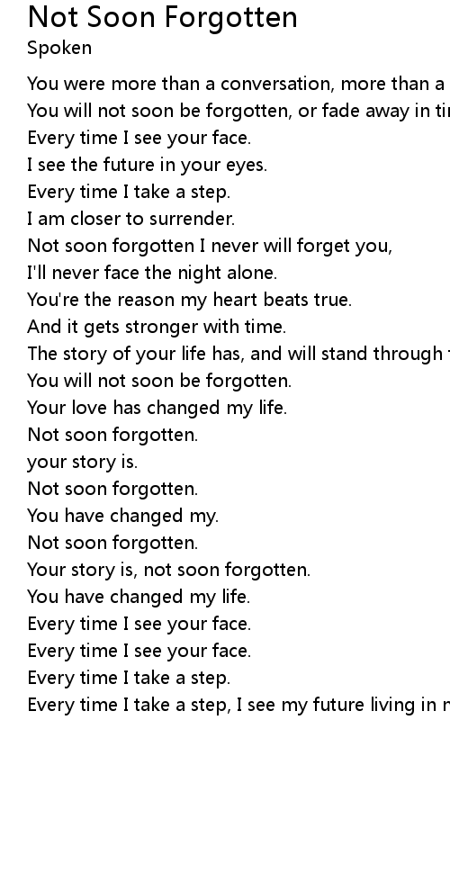 | Not soon forgotten I never will forget you, | |