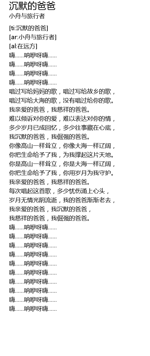 | [05:03.99] | wǒ qīn ài de bà bà, wǒ chén mò de bà bà, |