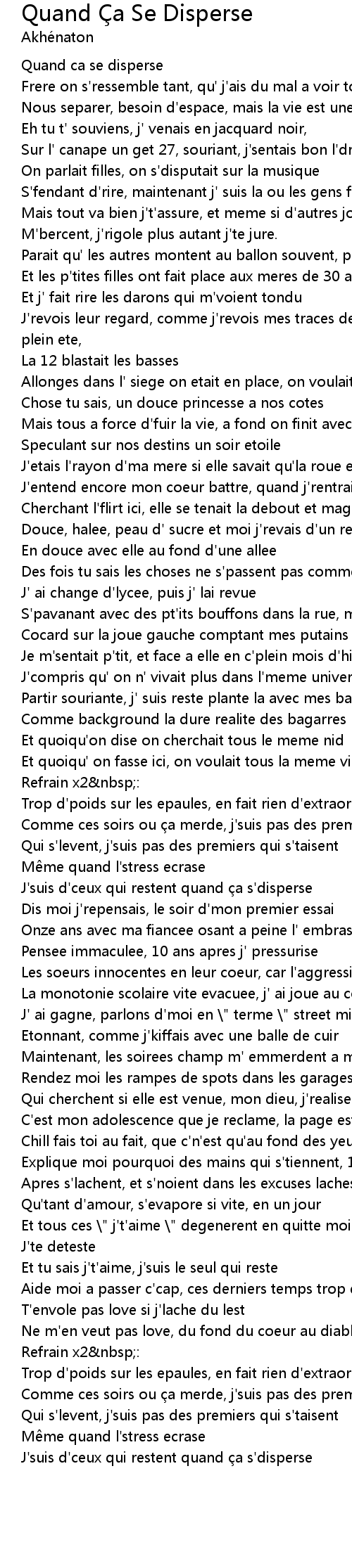 | J' suis d' ceux qui restent quand a s' disperse | |