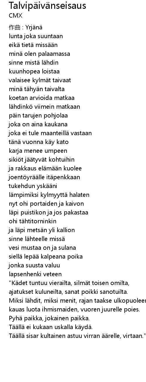 | "Kädet tuntuu vierailta, silmät toisen omilta, | |