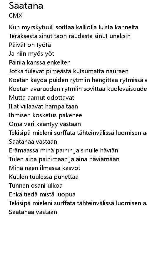 | Tekisip mieleni surffata t hteinv liss luomisen aaltoa pitk kilvan Saatanaa vastaan |