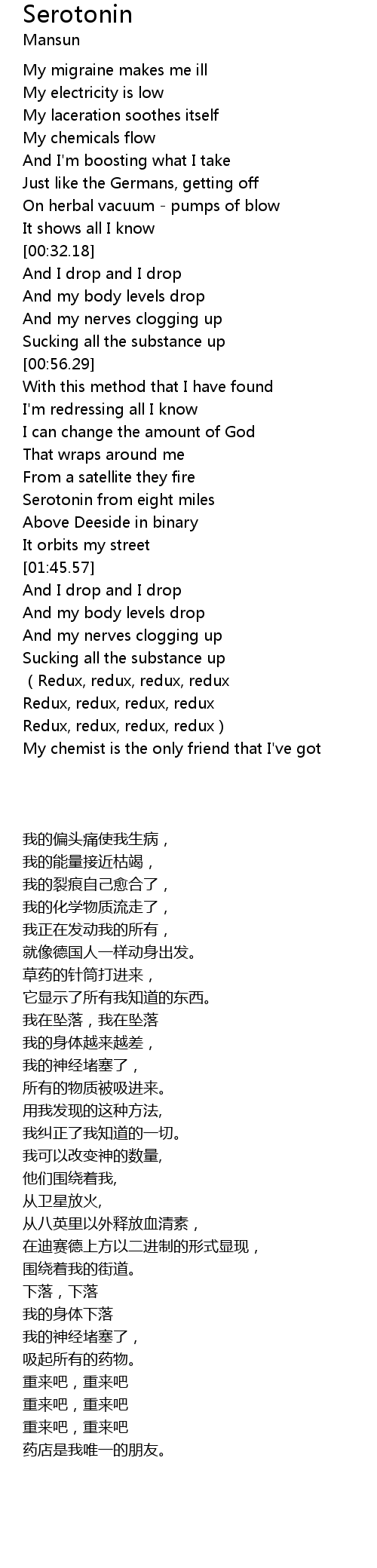 | [01:31.02] | Serotonin from eight miles |