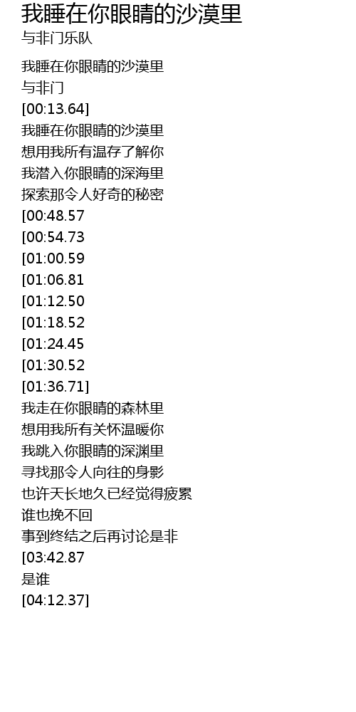 | [00:03.65] | 我睡在你眼睛的沙漠里 |