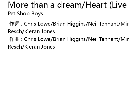 | [00:00.000] | 作曲 : Chris Lowe/Brian Higgins/Neil Tennant/Miranda Cooper/Jason Resch/Kieran Jones |