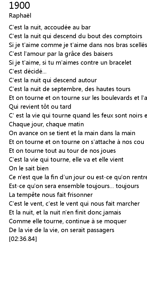 | [01:14.35] | Et on tourne et on tourne sur les boulevards et l'amour... |