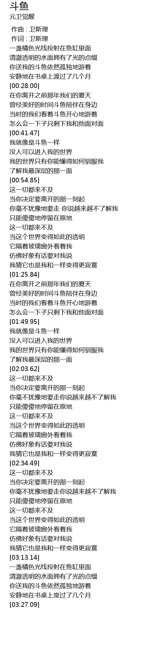 | [03:19.84] | 你送我的斗鱼依然孤独地游着 |