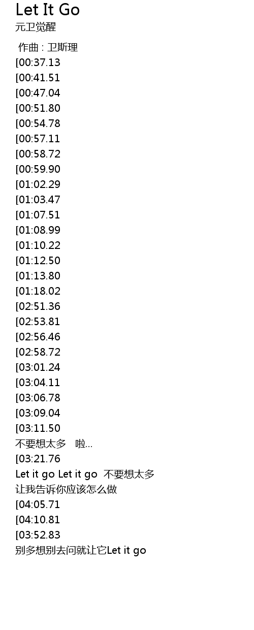 | [03:16.70][03:11.50][01:51.56][01:46.43][01:41.21] | Let it go Let it go bu yao xiang tai duo la... |