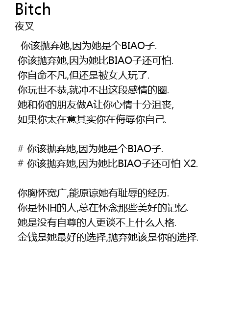 | # 你该抛弃她,因为她是个BIAO子. | |
