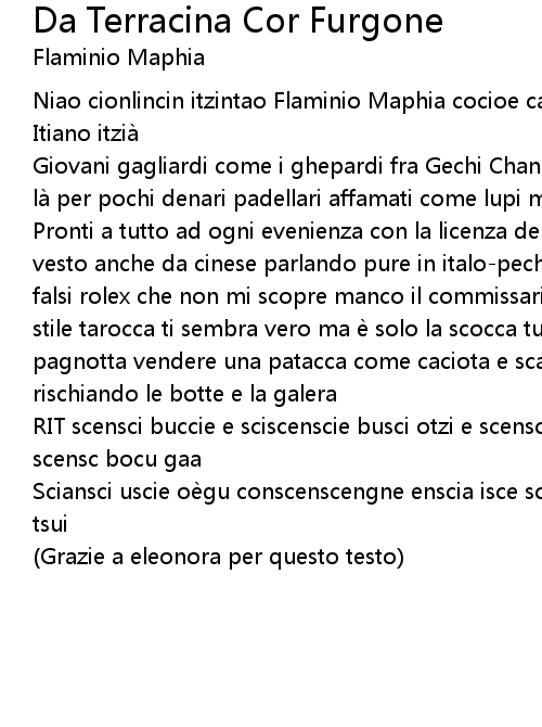 | Pronti a tutto ad ogni evenienza con la licenza dell' indecenza pe' lavora mi vesto anche da cinese parlando pure in italopechinese vendendo accendini e falsi rolex che non mi scopre manco il commissario rex lo vuoi un telefonino stile tarocca ti sembra vero ma e solo la scocca tutto questo si fa per la pagnotta vendere una patacca come caciota e scambialla pe' roba che sembra vera rischiando le botte e la galera | |