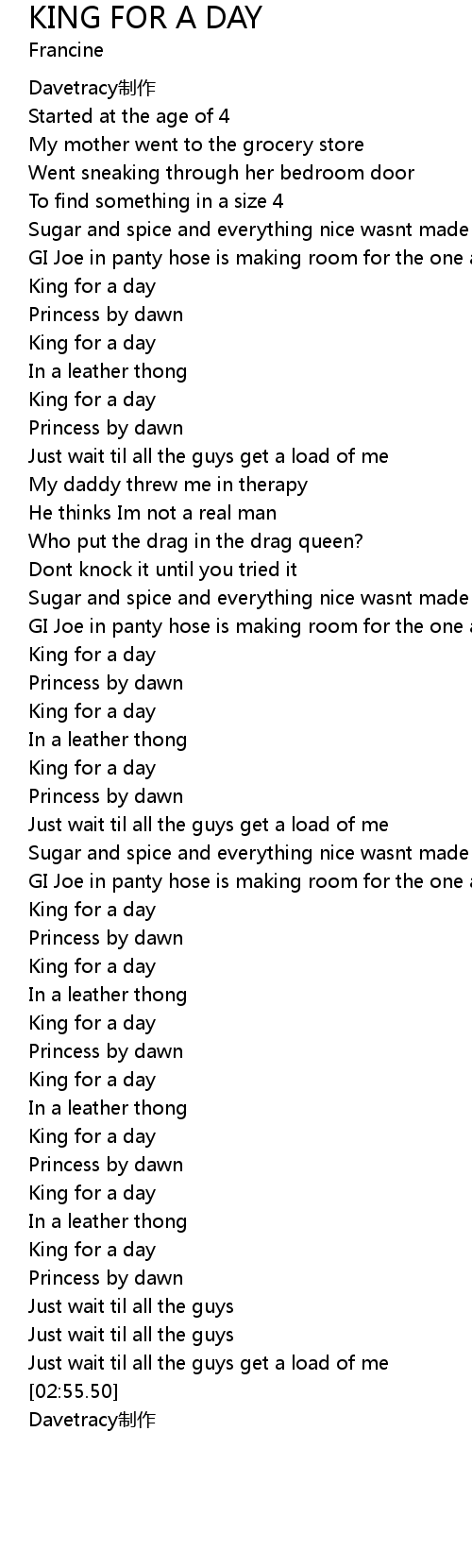 | [02:03.50] | GI Joe in panty hose is making room for the one and only |