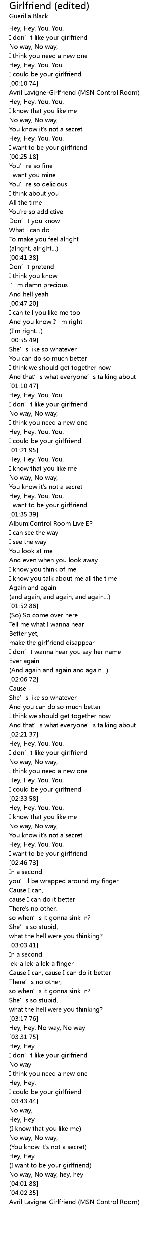| [00:11.36] | Avril LavigneGirlfriend MSN Control Room |
