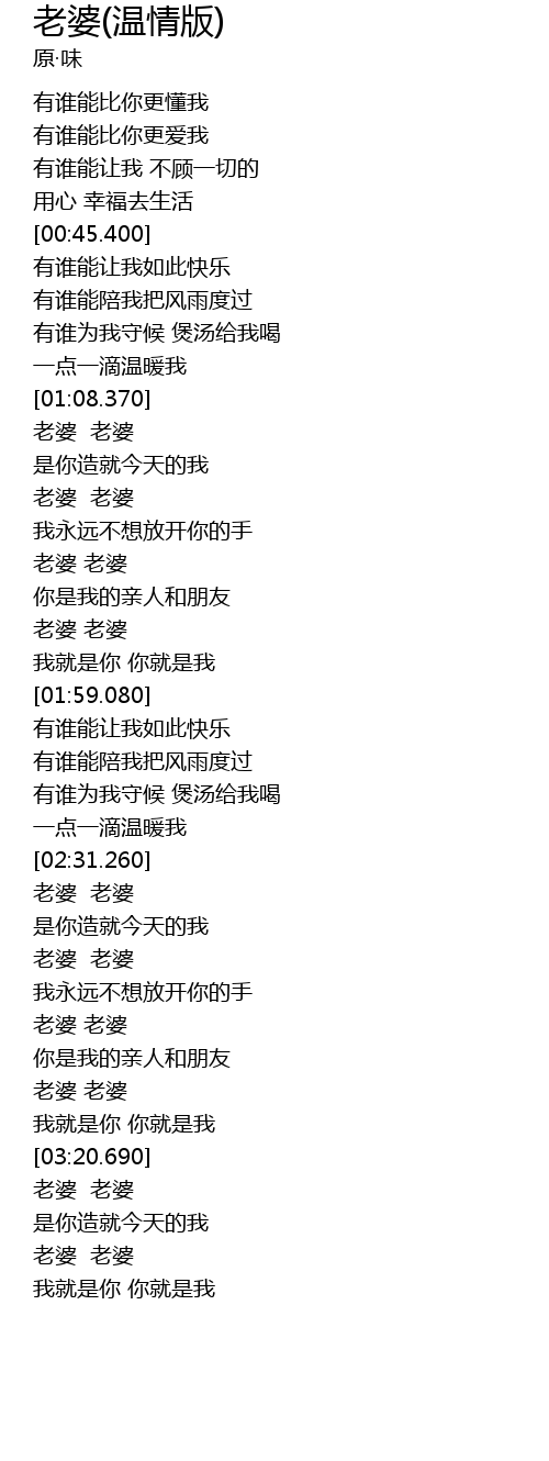 | [02:20.710] | 有谁为我守候 煲汤给我喝 |