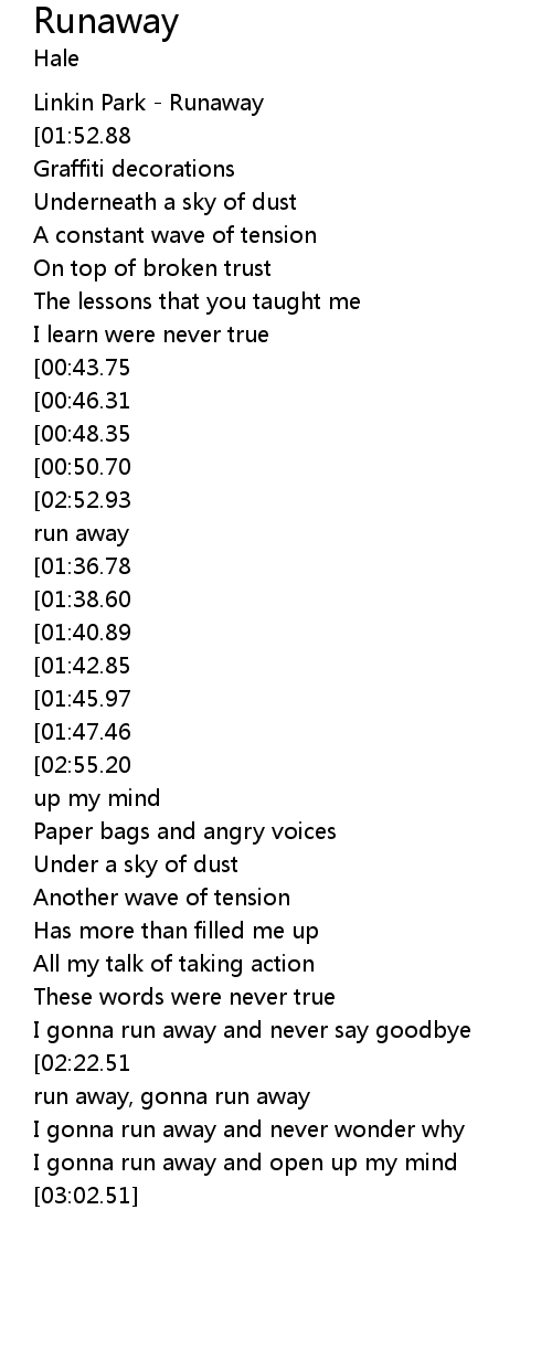 | [02:24.83][02:22.51][02:20.12][02:18.36][02:11.45][02:08.99][02:02.57][02:00.84] | Gonna run away, gonna run away |
