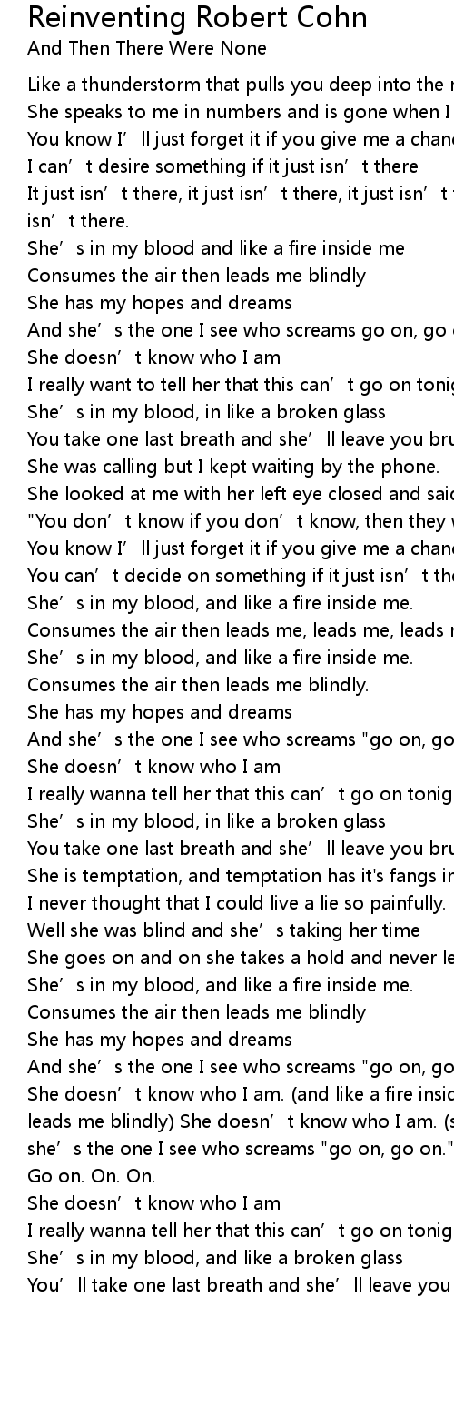 | She doesn’t know who I am. (and like a fire inside me, consumes the air then leads me blindly) She doesn’t know who I am. (she has my hopes and dreams, and she’s the one I see who screams "go on, go on.") | |