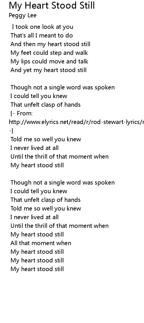 [- From: http://www.elyrics.net/read/r/rod-stewart-lyrics/my-heart-stood-still-lyrics.html -] |