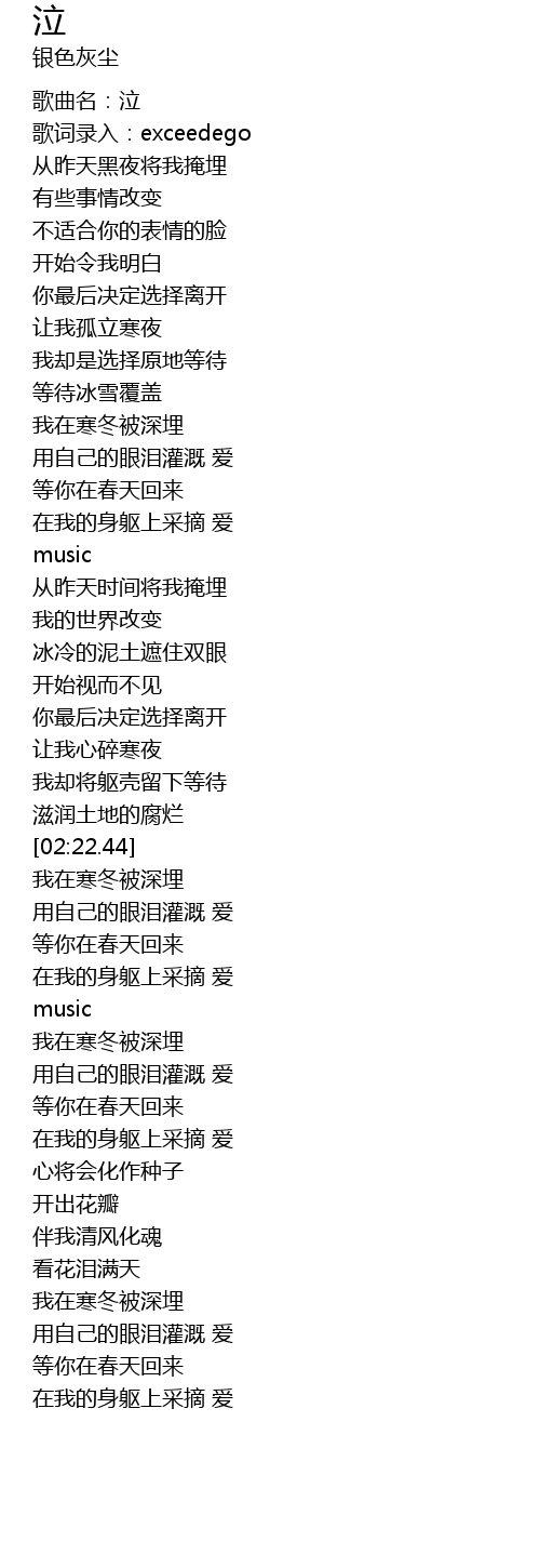 | [00:22.56] | 从昨天黑夜将我掩埋 |
