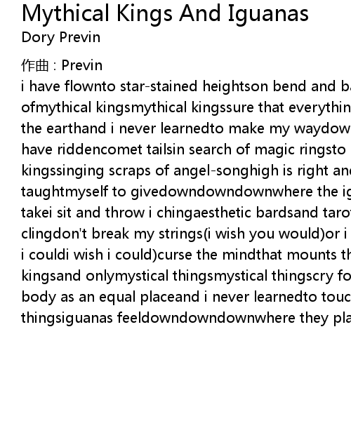 | i have flownto starstained heightson bend and battered wingsin search ofmythical kingsmythical kingssure that everything of worthis in the sky and not the earthand i never learnedto make my waydowndowndownwhere the iguanas playi have riddencomet tailsin search of magic ringsto conjuremythical kingsmythical kingssinging scraps of angelsonghigh is right and low is wrongand i never taughtmyself to givedowndowndownwhere the iguanas liveastral walks i try to takei sit and throw i chingaesthetic bardsand tarot cardsare the cordsto which i clingdon' t break my strings i wish you would or i will fall i wish i couldi wish i couldi wish i could curse the mindthat mounts the cloudsin search of mythical kingsand onlymystical thingsmystical thingscry for the soulthat will not facethe body as an equal placeand i never learnedto touch for realor feel the thingsiguanas feeldowndowndownwhere they playteach meteach meteach mereach me. |