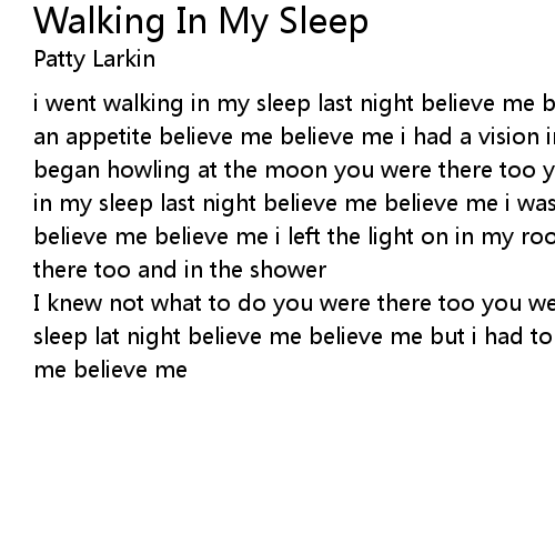 | I knew not what to do you were there too you were there too i went walking in my sleep lat night believe me believe me but i had to leave before daylight believe me believe me |