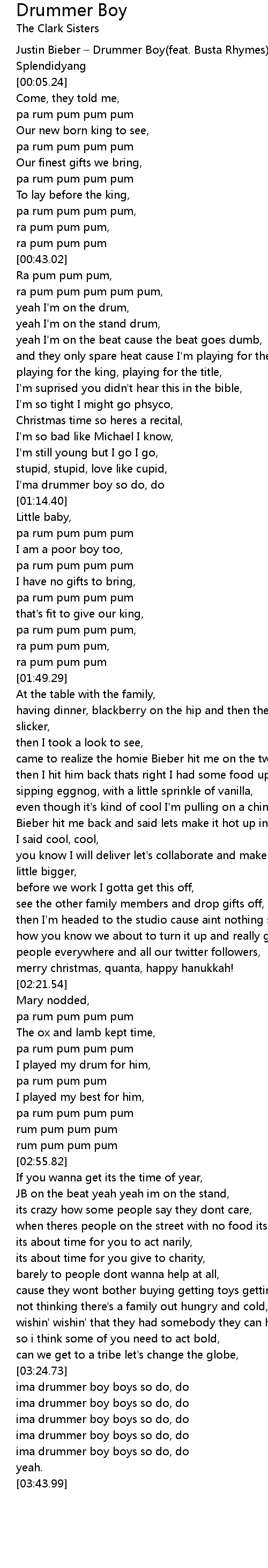 | [00:01.23] | Justin Bieber – Drummer Boy(feat. Busta Rhymes) |