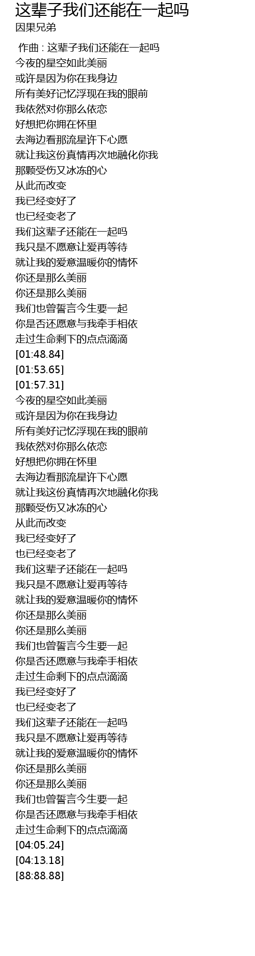 | [03:30.30] | wǒ men zhè bèi zi hái néng zài yì qǐ ma |